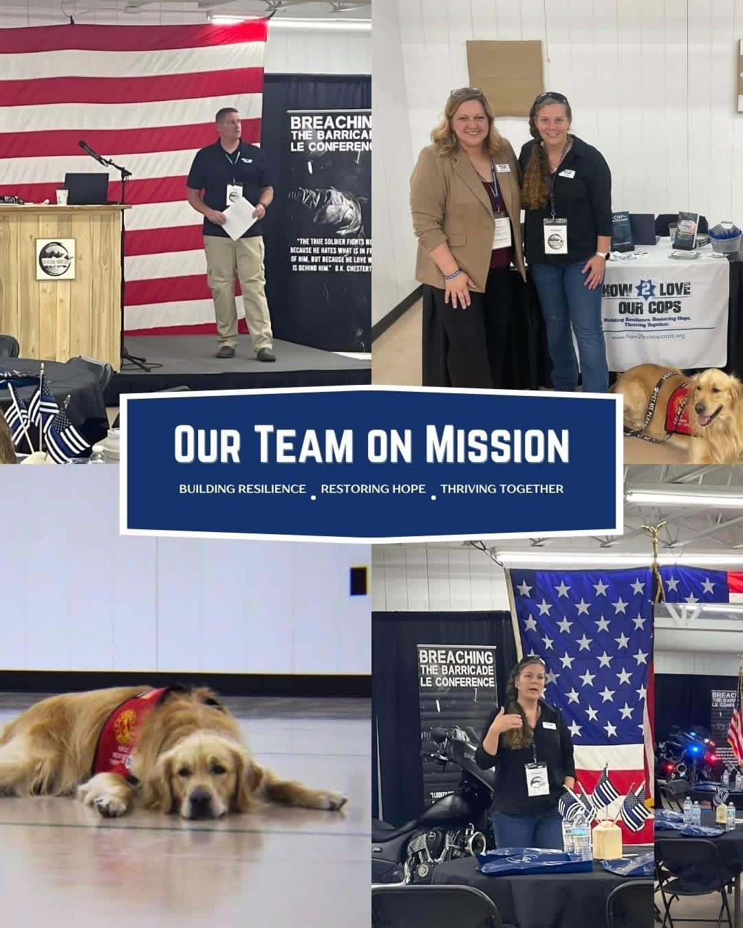 At the recent Breaching the Barricade event, A two-day conference and appreciation day for Law Enforcement families, in Indiana. Our state liaisons Tina and Jennifer shined as both presenters and Law Enforcement parents. The event brought together officers, spouses, and families for a time of encouragement, connection, and renewal. Tina and her husband Jeff, a retired Maine State Trooper, shared powerful insights from their journey in law enforcement life, alongside their lovable therapy dog. Brawny without question stole the show with his gentle spirit and wagging tail. Together, Tina and Jennifer modeled what it means to serve with compassion, embodying the mission of How 2 Love Our Cops, in every way.